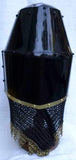 With attached padded cotton liner This Royal Over Bearer Great Helm might have been worn with a secondary helm underneath,although it can be worn singly also. The sides of the helm are reinforced with rivets and strips of metal, while the face features narrow rectangular eyelets, as well as two small star cut-outs near the elongated front rim. Also adorning the helmets front is a crown pattern, made up of small punched-out holes.